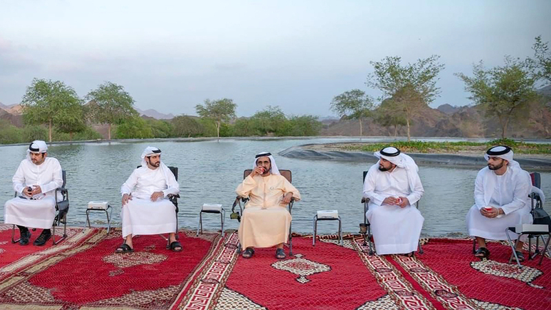 صاحب السمو الشيخ محمد بن راشد آل مكتوم، نائب رئيس الدولة رئيس مجلس الوزراء حاكم دبي، خلال زيارة سموه إلى حتا، يرافقه سمو الشيخ حمدان بن محمد بن راشد آل مكتوم، ولي عهد دبي رئيس المجلس التنفيذي، وسمو الشيخ مكتوم بن محمد بن راشد آل مكتوم، نائب حاكم دبي نائب رئيس مجلس الوزراء وزير المالية، وسمو الشيخ أحمد بن محمد بن راشد آل مكتوم، رئيس مجلس دبي للإعلام وسمو الشيخ منصور بن محمد بن راشد آل مكتوم.