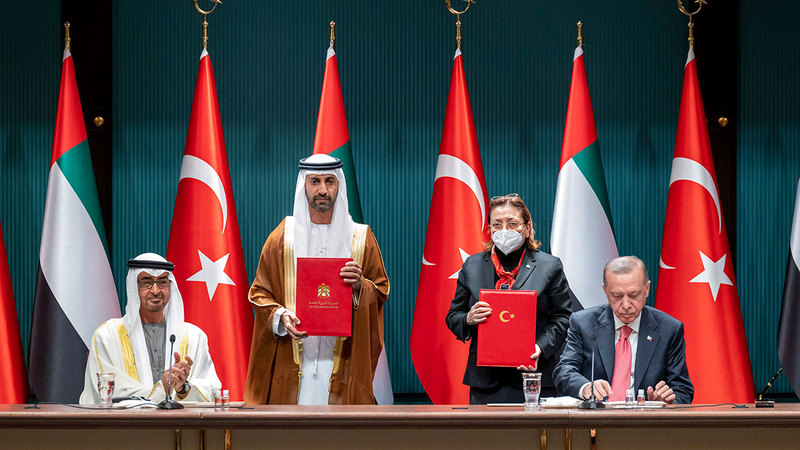وشهد صاحب السمو الشيخ محمد بن زايد آل نهيان، والرئيس رجب طيب أردوغان توقيع اتفاقيات ومذكرات تفاهم بين دولة الإمارات وتركيا، في عدد من المجالات التي تسهم في تعزيز علاقات التعاون وفتح آفاق جديدة للعمل المشترك بين الجانبين.