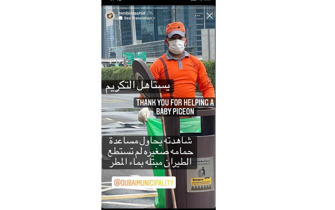 أشادت حرم سمو الشيخ منصور بن زايد آل نهيان نائب رئيس مجلس الوزراء وزير شؤون الرئاسة، سمو الشيخة منال بنت محمد بن راشد آل مكتوم، رئيسة مجلس الإمارات للتوازن بين الجنسين، رئيسة مؤسسة دبي للمرأة بعامل نظافة في بلدية دبي، لقيامه بحماية ومساعدة حمامة صغيرة كانت عاجزة عن الطيران.