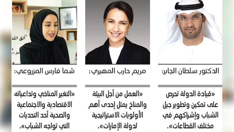 من جانبها، قالت وزيرة دولة لشؤون الشباب نائب رئيس مركز الشباب العربي، شما بنت سهيل بن فارس المزروعي، إن «التغير المناخي وتداعياته الاقتصادية والاجتماعية والصحية يمثل واحداً من أهم التحديات التي تواجه الشباب في العالم، وتهدد فرصه المستقبلية بتحقيق التنمية وتحسين جودة الحياة، ولذلك ليس غريباً أن نرى الشباب حول العالم في صدارة المشهد على كل الصعد، لإطلاق المبادرات البيئية، وحماية مقدرات مستقبلهم».
