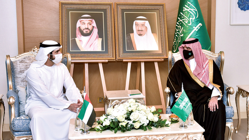 وجرى خلال اللقاء تبادل الأحاديث الودية حول تعزيز الروابط الأخوية المتميزة التي تجمع دولة الإمارات العربية المتحدة بالمملكة العربية السعودية، وما تشهده العلاقات بين البلدين من تطور ونمو مستمر، بقيادة صاحب السمو الشيخ خليفة بن زايد آل نهيان، رئيس الدولة، وأخيه خادم الحرمين الشريفين الملك سلمان بن عبدالعزيز آل سعود، عاهل المملكة العربية السعودية الشقيقة.