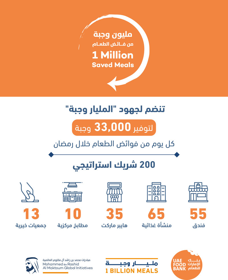 وتهدف حملة «مليون وجبة من فائض الطعام» إلى توفير 33 ألف وجبة كل يوم من فوائض الطعام خلال شهر رمضان بالتعاون مع ما يقرب من 200 شريك استراتيجي من الفنادق والمنشآت الغذائية والمتاجر الكبرى وأسواق الخضار والفواكه والمطابخ المركزية والجمعيات الخيرية في الدولة.