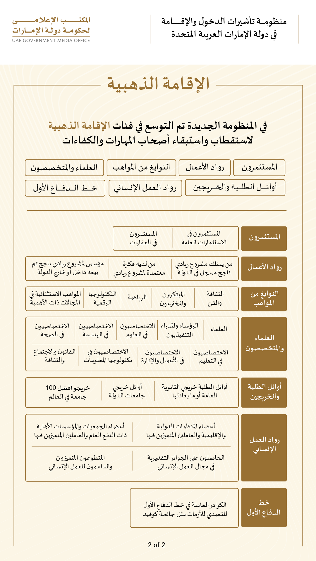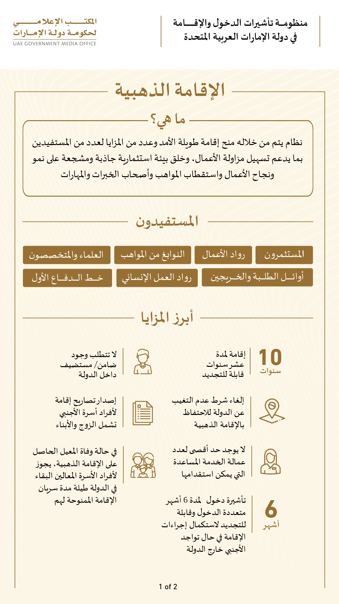 وحسب التحديثات جديدة ضمن الإقامة الذهبية في المنظومة الجديدة لتأشيرات الدخول والإقامة في الإمارات، تم توسيع نطاق المستفيدين والمزايا لتشمل 10 سنوات قابلة للتجديد في إطار استقطاب واستبقاء أصحاب المهارات والكفاءات.