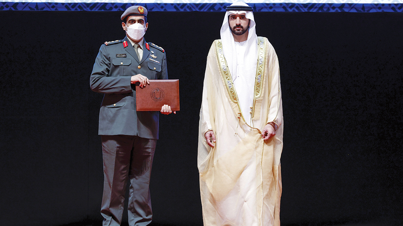 وسلّم سمو الشيخ حمدان بن محمد بن راشد آل مكتوم الشهادات للخريجين، بحضور سمو الشيخ منصور بن محمد بن راشد آل مكتوم، رئيس مجلس دبي لأمن المنافذ الحدودية، ووزير الدولة لشؤون الدفاع، محمد بن أحمد البواردي، ورئيس أركان القوات المسلحة، الفريق الركن حمد محمد ثاني الرميثي، والقائد العام لشرطة دبي، الفريق عبدالله خليفة المري.