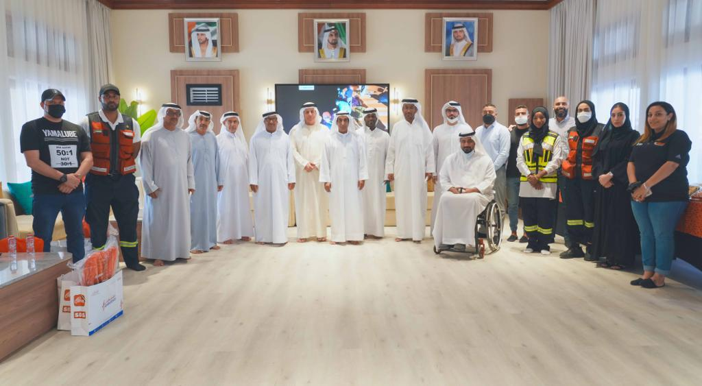 وقد قام فريق مؤسسة دبي لخدمات الاسعاف بتوزيع حقائب للإسعافات الاولية وعدد من سترات النجاة على المشاركين في المبادرة".