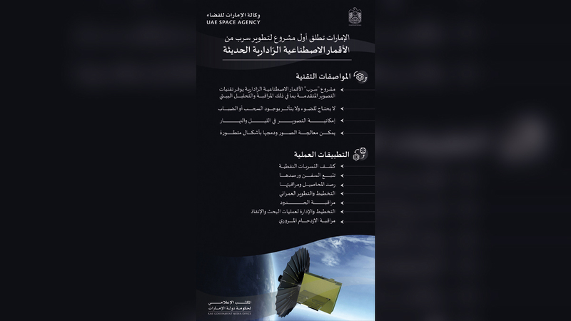 وقال صاحب السمو الشيخ محمد بن راشد آل مكتوم، في تغريدتين على «تويتر» أمس: «أطلقت الإمارات مشروع (سرب).. أول مشروع لتطوير سرب من الأقمار الصناعية الرادارية التي تستخدم تكنولوجيا تصوير حديثة ليلاً ونهاراً وفي كافة الظروف الجوية وبدقة متر واحد.. سرب الأقمار الصناعية الجديد هدفه تطوير تنافسيتنا في قطاع الفضاء والحفاظ على البيئة من عوامل التغير المناخي».