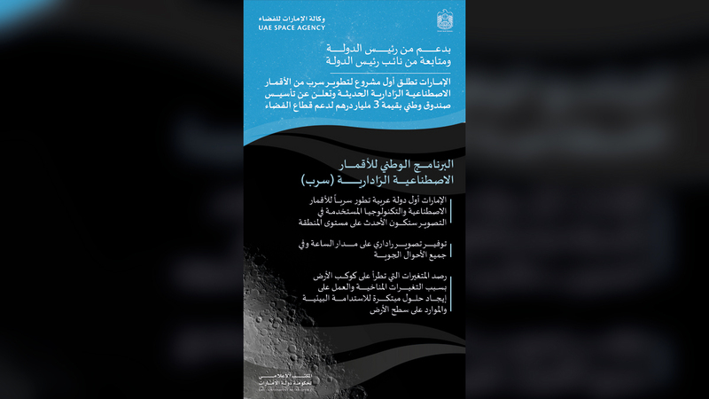 وقال صاحب السمو الشيخ محمد بن زايد آل نهيان، في تغريدة على «تويتر» أمس: «بتأسيس صندوق وطني لدعم قطاع الفضاء برأس مال ثلاثة مليارات درهم وإطلاق برنامج وطني لتطوير الأقمار الاصطناعية الرادارية الحديثة (سرب).. الإمارات تواصل العمل على إيجاد حلول مبتكرة للاستدامة البيئية وتأهيل كوادرها الوطنية في هذا القطاع الحيوي».