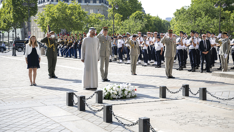زار صاحب السمو الشيخ محمد بن زايد آل نهيان، رئيس الدولة، أمس، النصب التذكاري للجندي المجهول في ميدان «قوس النصر» في مدينة باريس.. في إطار زيارة دولة أجراها سموه إلى الجمهورية الفرنسية.