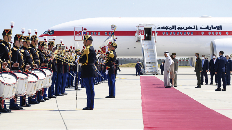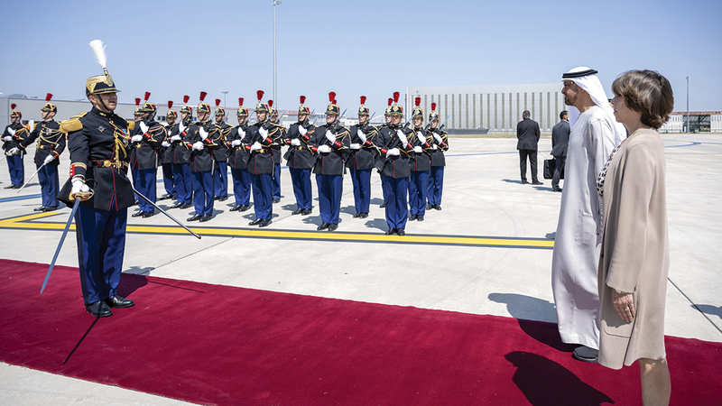 وأقيمت لسموه المراسم العسكرية الرسمية لدى وصوله مقر الصرح وعزف السلام الوطني لكل من دولة الإمارات والجمهورية الفرنسية.