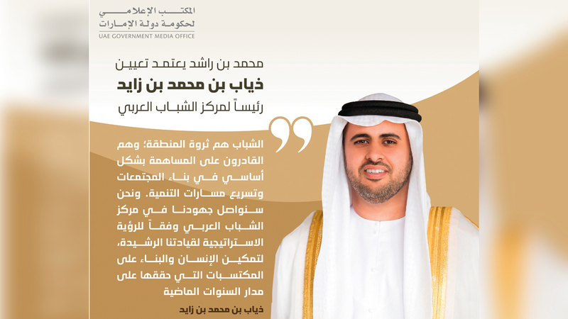 اعتمد صاحب السمو الشيخ محمد بن راشد آل مكتوم، نائب رئيس الدولة رئيس مجلس الوزراء حاكم دبي، تعيين سمو الشيخ ذياب بن محمد بن زايد آل نهيان رئيساً لمركز الشباب العربي، بالتزامن مع فعاليات اليوم العالمي للشباب.