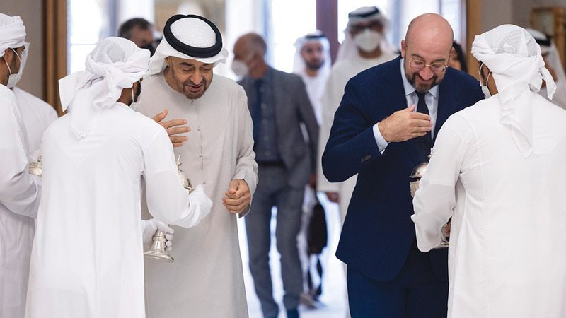 استقبل صاحب السمو الشيخ محمد بن زايد آل نهيان، رئيس الدولة، أمس، في قصر الوطن، رئيس المجلس الأوروبي، شارل ميشال، الذي بدأ زيارة عمل إلى الدولة.