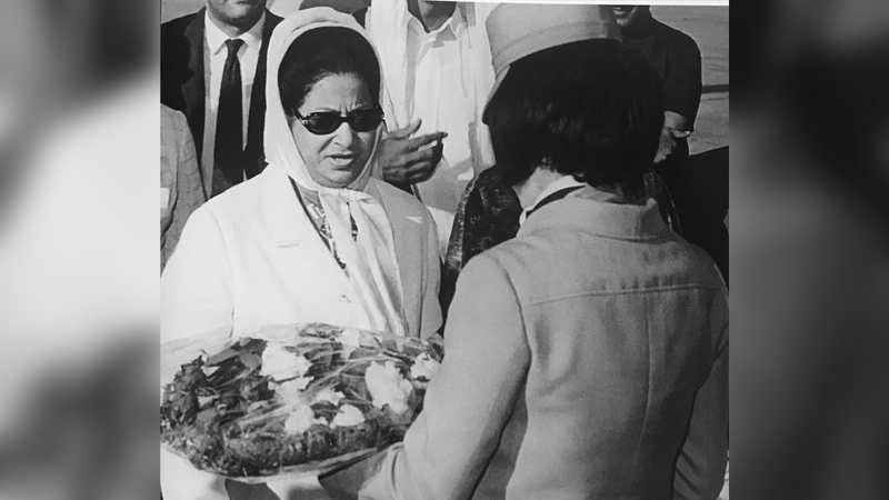 ويصف الكاتب محمد المر مشهد وصول أم كلثوم لأبوظبي، بأنه عندما حطّت طائرة الخطوط الجوية الكويتية في مطار البطين بأبوظبي في 26 نوفمبر عام 1971 كان في استقبال سيدة الغناء العربي العديد من الشخصيات الإماراتية المهمة، على رأسها الوزير العتيبة، ومدير دائرة التشريفات في أبوظبي سعيد الدرمكي، ونائب مدير الدائرة علي الشرفا. وفتحت قاعة الشرف بمطار أبوظبي لأم كلثوم تكريماً لها ولدورها الفني الريادي.