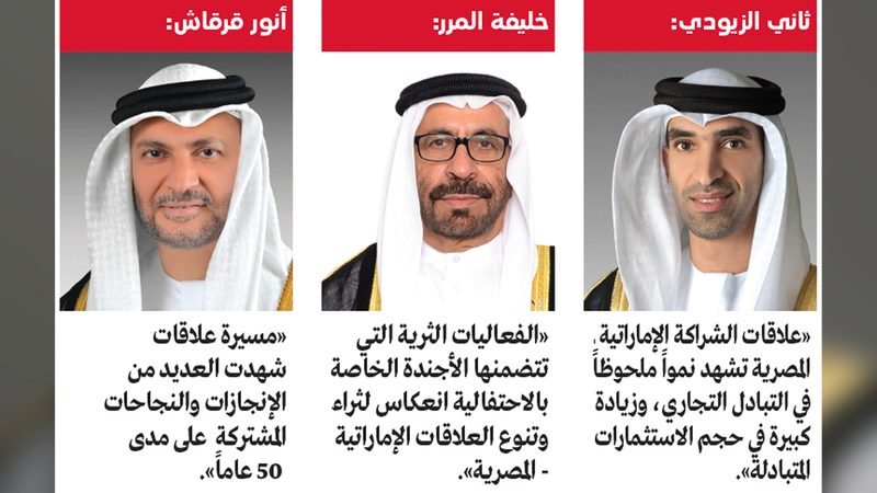 وقال وزير الاقتصاد عبدالله بن طوق المري: «يمثل الاحتفال بمرور 50 عاماً على تأسيس العلاقات الإماراتية - المصرية مناسبة غالية وعزيزة على قلب كل مواطن إماراتي، وكل مواطن مصري، وهي تعكس امتداداً لعلاقات أخوة ترسخت، وازدادت قوة ومتانة عبر العقود بين البلدين، قيادة وحكومة وشعباً، لتصبح بمثابة نموذج مضيء للعلاقات الثنائية بين الدول الشقيقة والصديقة عموماً، والدول العربية بصفة خاصة، وانعكس صداها وأثرها في مختلف القطاعات والمجالات، وعلى رأسها القطاع الاقتصادي».