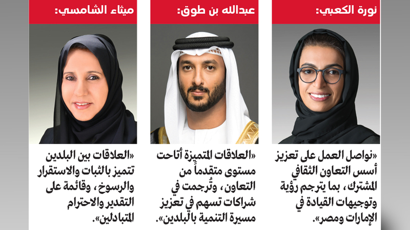 وفيما يتعلق بالعلاقات والتعاون في الشأن الثقافي بين البلدين، قالت وزيرة الثقافة والشباب نورة بنت محمد الكعبي: «يعكس الاحتفال بمرور 50 عاماً على تأسيس العلاقات الإماراتية - المصرية عمق الروابط الأخوية التي تربط بين البلدين الشقيقين منذ عقود، تحت قيادة رسّخت العلاقات المشتركة بين الإمارات ومصر، لما فيه خير ورفاه وازدهار البلدين والشعبين الشقيقين». وأضافت: «ونحن إذ نحتفي الآن بهذه المناسبة العزيزة، مستذكرين جهود رواد أسهموا في تميز وتوطيد العلاقات بين الإمارات ومصر، نواصل العمل على تعزيز أسس التعاون المشترك بما يترجم رؤية وتوجيهات القيادة في الإمارات ومصر، ويعزز مسيرة التنمية الشاملة لصالح شعبي البلدين الشقيقين، مؤكدين أهمية التركيز على الجانب الثقافي والابداعي، ومثمنين إسهامات وجهود الشباب المصريين في الإمارات، وطنهم الثاني». أما في ما يتعلق بواقع العلاقات الاقتصادية والتجارية بين البلدين؛ فقال وزير دولة للتجارة الخارجية، الدكتور ثاني بن أحمد الزيودي: «تعد العلاقات الاقتصادية والتجارية بين مصر والإمارات نموذجاً يحتذى في العلاقات العربية والإقليمية»، مشيراً إلى أن «علاقات الشراكة بين البلدين تشهد نمواً ملحوظاً في التبادل التجاري، وزيادة كبيرة في حجم الاستثمارات المتبادلة، على نحو يعكس خصوصية العلاقات المشتركة بين البلدين».