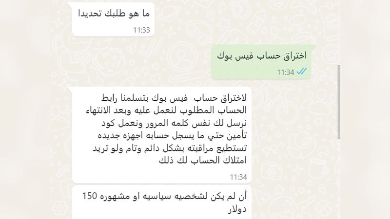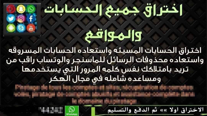 وتفصيلاً، انتشرت إعلانات عبر وسائل التواصل الاجتماعي، تدعو الراغبين في اختراق الحسابات الشخصية واستعادة الحسابات المسروقة والمواقع الإلكترونية للتواصل عبر «واتس أب»، وتسديد مبلغ مالي بـ«الدولار» نظير إتمام تقديم خدمات «الاختراق» لهم.