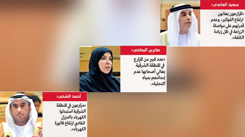فيما قال عضو المجلس الوطني الاتحادي، أحمد عبدالله الشحي، إن المجلس ناقش ارتفاع فواتير الكهرباء والماء على مزارع المواطنين خلال الجلسات الماضية مع الجهات والوزارات المختصة، وتم طرح العديد من الأسئلة بهذا الشأن، وطالب أعضاء بضرورة دعم المزارعين في شتى المجالات باعتبارهم من أهم ركائز الأمن الغذائي في الدولة.