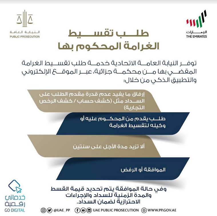 ونوّهت النيابة، في منشور إرشادي على صفحاتها الرسمية بمنصات التواصل الاجتماعي، إلى أن مدّة أجل تقسيط الغرامة المحكوم بها، لا تزيد على سنتين، لافتة إلى أن الوثائق المطلوبة للخدمة تشمل، إثبات شخصية مقدم الطلب، إرفاق ما يفيد عدم قدرة مقدم الطلب على السداد مثل (كشف حساب / كشف الرخص التجارية)، جواز سفر لكفيل يتعهد بالسداد في حالة تخلّف المتهم عن السداد أو هروبه.