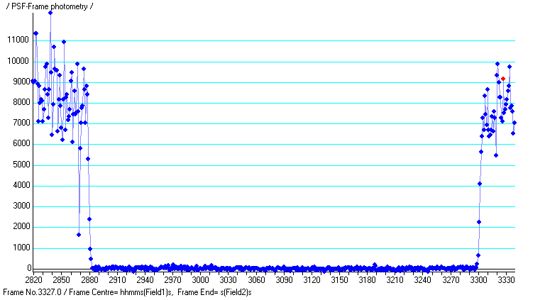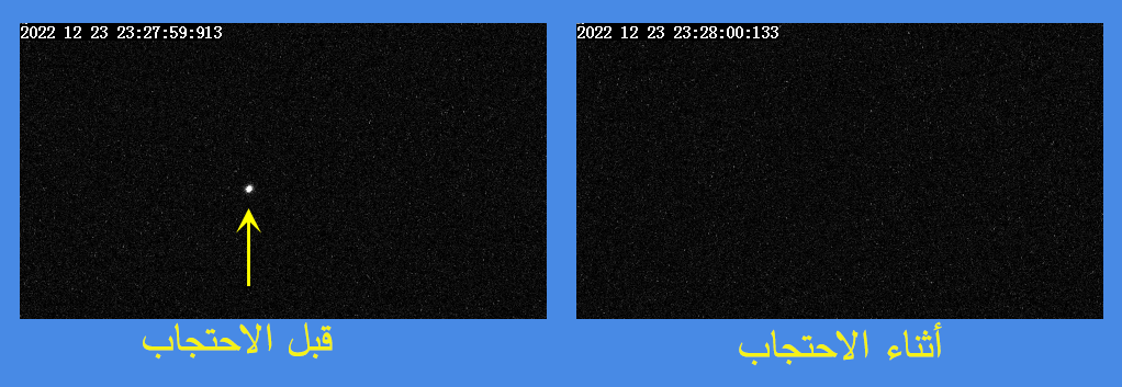 واستعدادا للاحتجاب، تم توجيه التلسكوب الرئيسي لمرصد الختم الفلكي والبالغ قطره 14 إنش نحو النجم في الساعة الثالثة فجرا، وفور توجيه التلسكوب نحوه شوهد من خلال الأجهزة بوضوح، وبقي النجم ظاهرا إلى أن اختفى في الساعة 03 فجرا و27 دقيقة و59.953 ثانية، واستمر الاحتجاب لمدة 8 ثواني إلى أن عاد النجم بالظهور في الساعة 03 فجرا و28 دقيقة و08.460 ثانية.