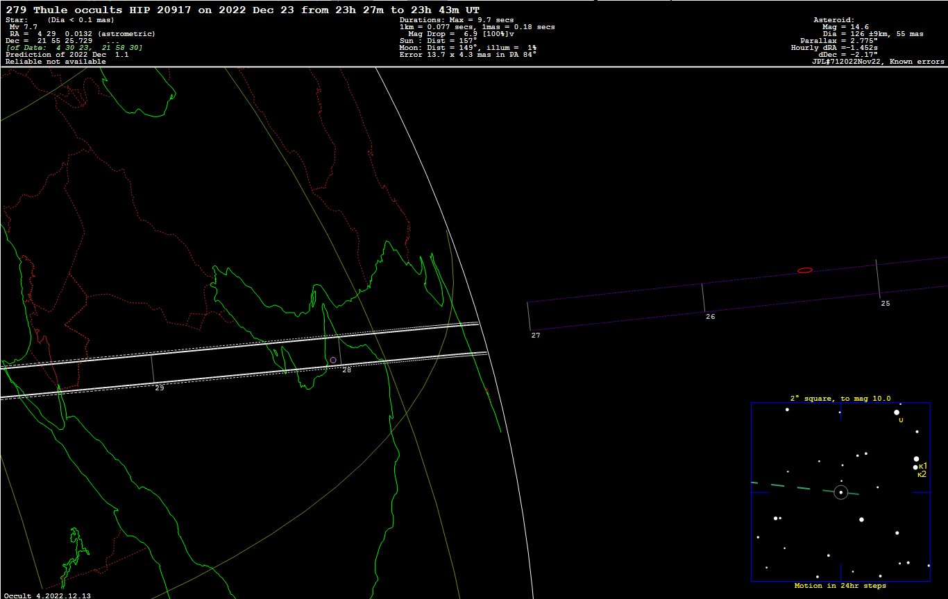 وأضاف المركز أن قطر الكويكب بلغ "ثولي" 126 كيلومتر فقط، وكان يقع وقت الاحتجاب على مسافة 474 مليون كيلومتر من الأرض، في حين يبعد عنا النجم 37 سنة ضوئية. وبينت الحسابات الفلكية المسبقة بالنسبة لموقع المرصد بأن الكويكب سيعبر أمام النجم ويبدأ الاحتجاب يوم السبت 24 ديسمبر في الساعة 03 فجرا و28 دقيقة بتوقيت الإمارات، ويستمر الاحتجاب لمدة 8 ثواني فقط، وخلال هذه الفترة يختفي النجم عن الأنظار بسبب مرور الكويكب الخافت أمامه.