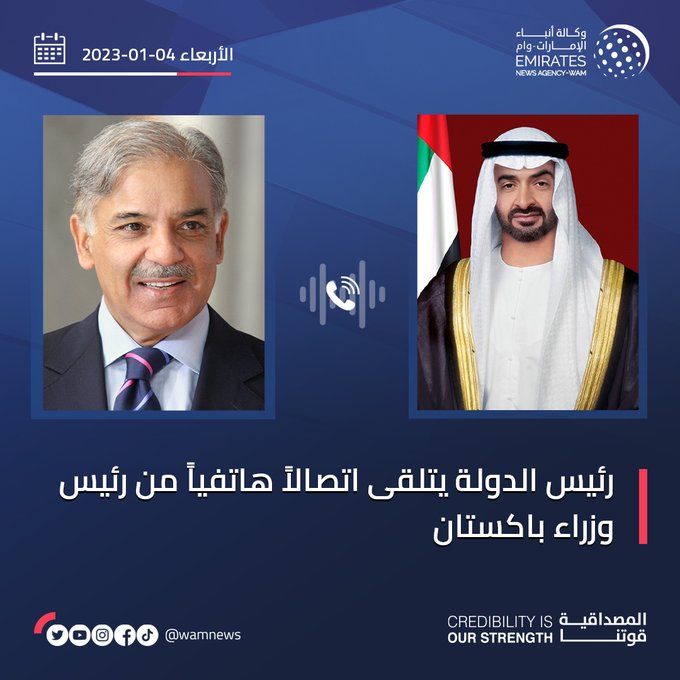 تلقى صاحب السمو الشيخ محمد بن زايد آل نهيان رئيس الدولة، اتصالاً هاتفياً يوم أمس، من دولة شهباز شريف رئيس وزراء جمهورية باكستان الإسلامية الصديقة، بحثا خلاله العلاقات الثنائية بين البلدين وسبل دعمها وتعزيزها في مختلف المجالات إضافة إلى عدد من القضايا الإقليمية والدولية محل الاهتمام المشترك.