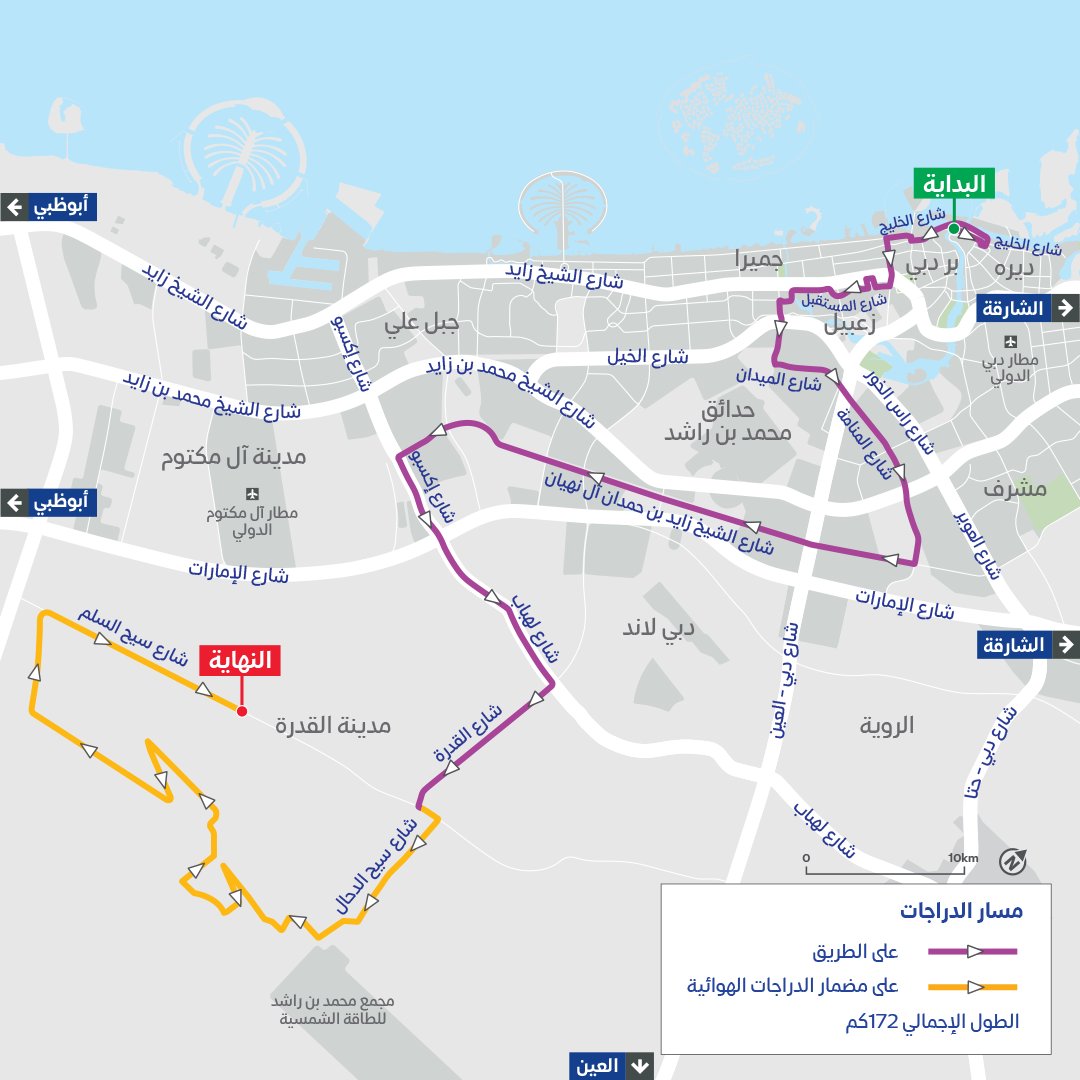 وتتضمن قائمة الشوارع المتأثرة كل من شارع جميرا، وجسر انفينيتي، وشارع الخليج، وشارع الثاني من ديسمبر، وشارع زعبيل الثاني، وشارع المستقبل مع الدوران خلف متحف المستقبل، وشارع الميدان، وشارع المنامة، وشارع الشيخ زايد بن حمدان، وشارع اكسبو، وشارع لهباب، وشارع البورصة، وشارع القدرة عند الانتهاء في مسار القدرة للدراجات الهوائية.
