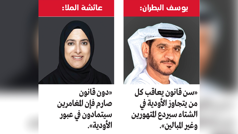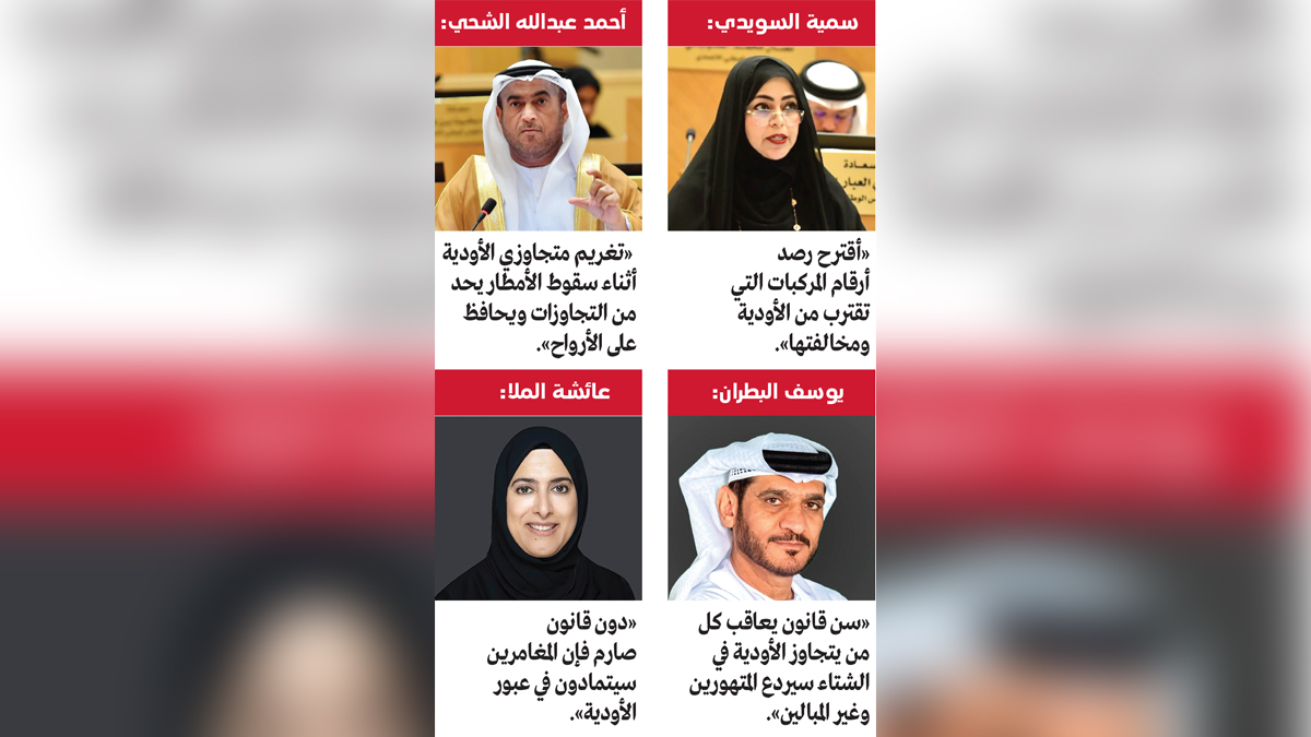 وأيدته عضو المجلس، عائشة الملا، قائلة إن سن قانون يجرم تجاوز الأودية شتاءً يعتبر إجراء وقائياً رادعاً للسائقين المتهورين، لأنه يحافظ عليهم. وتابعت أنه دون قانون صارم فإن «المغامرين» سيتمادون في عبور الأودية.
