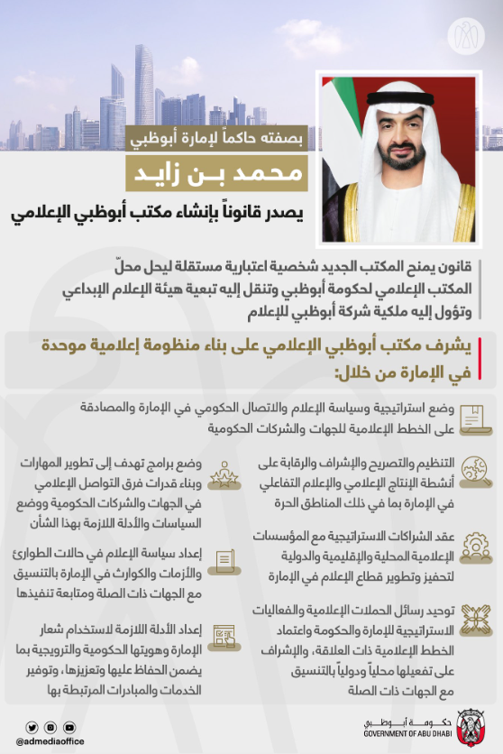أصدر صاحب السمو الشيخ محمد بن زايد آل نهيان رئيس الدولة، بصفته حاكماً لإمارة أبوظبي، قانوناً بإنشاء "مكتب أبوظبي الإعلامي" ليحل محل "المكتب الإعلامي لحكومة أبوظبي" وتنقل إليه تبعية هيئة الإعلام الإبداعي كما تؤول إليه ملكية شركة أبوظبي للإعلام.