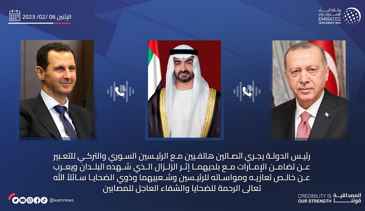 رئيس الدولة يجري اتصالين هاتفيين مع الرئيسين السوري والتركي للتعبير عن تضامن الإمارات مع بلديهما إثر الزلزال الذي شهده البلدان