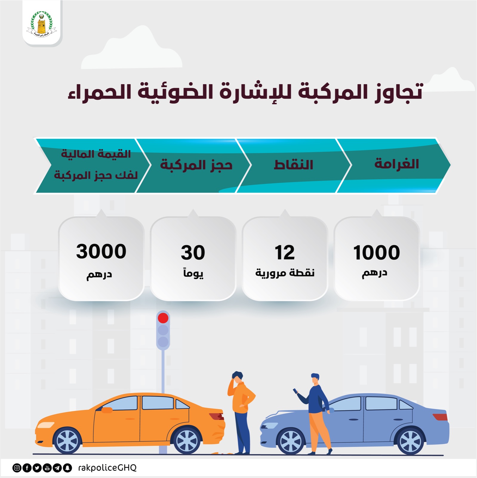 وأضاف أن عقوبة مخالفة تجاوز الاشارة الحمراء حسب المادة 33 من قانون السير والمرور تنص على غرامة مالية قدرها 1000درهم و 12 نقطة مرورية وحجز المركبة 30 يوماً، مناشداً مستخدمي الطريق بضرورة الالتزام بأنظمة وقوانين السير والمرور، والتركيز اثناء القيادة او عند انتظار عبور الاشارة الضوئية وتجنب استخدام الهاتف تجنباً لانحراف المركبة او تجاوز الاشارة والتقيد بالسرعات القانونية على الطرق، متمنياً السلامة المرورية