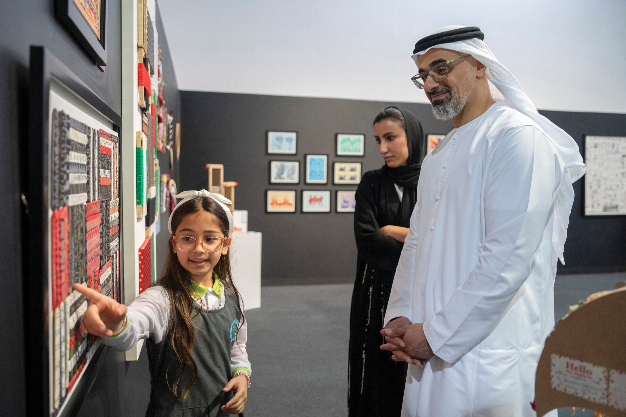 والتقى سموه بعض الطلبة المشاركين في المعرض، وتعرف منهم على مصدر إلهامهم في أعمالهم الفنية، وأهمية المعرض وما يَضمّه من أنشطة وورش تدريبية في تعزيز عناصر الهوية والثقافة الإماراتية لديهم.