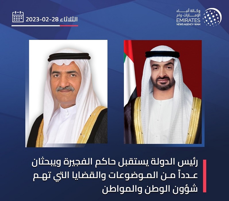 وبحث صاحب السمو رئيس الدولة وصاحب السمو حاكم الفجيرة خلال اللقاء ،عدداً من الموضوعات والقضايا التي تهم شؤون الوطن والمواطن.