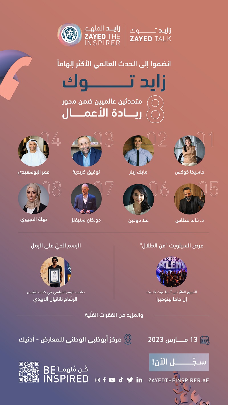 تحت رعاية الفريق سمو الشيخ سيف بن زايد آل نهيان نائب رئيس مجلس الوزراء وزير الداخلية ، تُنظِّم المنصة العالميَّة للإلهام، "زايد المُلهم" حدث "زايد توك"، الحدث العالمي الأكثر إلهاماً.