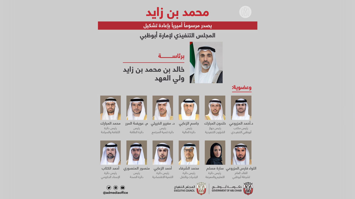 أصدر صاحب السمو الشيخ محمد بن زايد آل نهيان، رئيس الدولة، بصفته حاكماً لإمارة أبوظبي، مرسوماً أميرياً بإعادة تشكيل المجلس التنفيذي لإمارة أبوظبي برئاسة سمو الشيخ خالد بن محمد بن زايد آل نهيان ولي العهد.