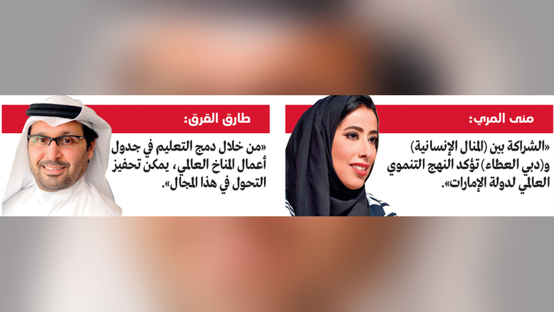 وقالت رئيسة مجلس إدارة مؤسسة دبي للمرأة والعضو المنتدب، منى المري، إن دعم مبادرة المنال الإنسانية لجهود «دبي العطاء» في تسليط الضوء على أهمية ومكانة التعليم كأداة مهمة في التوعية بالتحديات المناخية الحالية التي تهدد كوكب الأرض، يأتي في إطار الشراكة المُمتدة بين الطرفين عبر السنوات الماضية في المجال التعليمي، خصوصاً تعليم الفتيات، بما يسهم في بناء القدرات العلمية والمعرفية للشباب، وتمكينهم من الإسهام في التعامل مع القضايا الحيوية، وتحسين حياة الناس، وإحداث تغييرات ملموسة في مجتمعاتهم، مؤكدةً أن هذه الجهود المشتركة تسهم في تعزيز المكانة العالمية لدولة الإمارات، والتأكيد على نهجها الثابت في المشاركة الفاعلة في إيجاد حلول للتحديات التي تواجه العالم، وفي مقدمتها قضية التغيرات المناخية، لارتباطها بكثير من القضايا الأخرى، مثل الصحة والمياه والتعليم والتنمية والاقتصاد والتوازن بين الجنسين، وتشكل جميعها محاور أهداف التنمية المستدامة.
