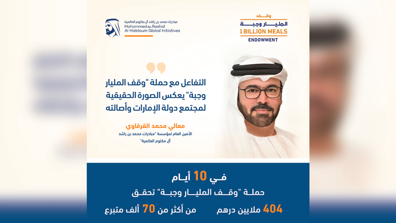 وأكد الأمين العام لمؤسسة «مبادرات محمد بن راشد آل مكتوم العالمية» محمد القرقاوي أن التفاعل الكبير مع حملة «وقف المليار وجبة» التي تدشن أكبر صندوق وقفي لإطعام الطعام في رمضان بشكل مستدام، يعكس الصورة الحقيقية لمجتمع دولة الإمارات وأصالته، وتمسكه بخصلة العطاء ومساعدة الآخرين.