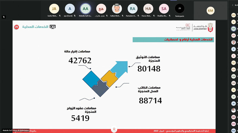 وقال مدير إدارة التخطيط الاستراتيجي والتطوير المؤسسي بالدائرة، عبدالله سيف زهران، إن الدائرة أقرت حزمة مشاريع سيتم تنفيذها خلال العام الجاري 2023، تتضمن تنفيذ 12 مشروعاً تطويرياً، و28 خطة عمل، لافتاً في الوقت نفسه إلى وجود 284 مؤشراً منها 145 مؤشراً يختص بأعمال المحاكم والنيابات، و139 مؤشراً إدارياً، تستهدف جميعها قياس وتطوير منظومة العمل في الدائرة، بما يحقق أهدافها الاستراتيجية ورؤية قيادتنا.