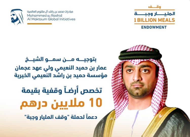 بتوجيه من سمو الشيخ عمار بن حميد النعيمي ولي عهد عجمان رئيس المجلس التنفيذي رئيس مجلس أمناء مؤسسة حميد بن راشد النعيمي الخيرية، أعلنت المؤسسة عن تخصيص أرض في وقف الشيخ راشد بن حميد النعيمي "رحمه الله" بعجمان ضمن المدينة الوقفية، بقيمة 10 ملايين درهم لدعم حملة "وقف المليار وجبة" التي أطلقها صاحب السمو الشيخ محمد بن راشد آل مكتوم نائب رئيس الدولة رئيس مجلس الوزراء حاكم دبي، لتدشين أكبر صندوق وقفي لإطعام الطعام في رمضان بشكل مستدام.