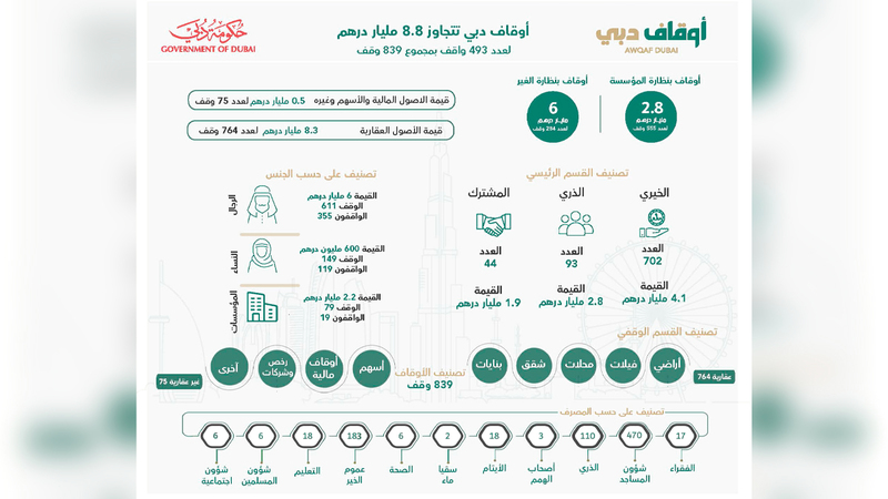 وتجاوزت قيمة الأصول الوقفية 8.8 مليارات درهم، تنوعت ما بين أوقاف خيرية وذُريّة ومشتركة، وتوزعت بواقع 611 وقفاً قدّمها رجال، و149 وقفاً قدمتها نساء، و79 وقفاً قدمتها جهات ومؤسسات.