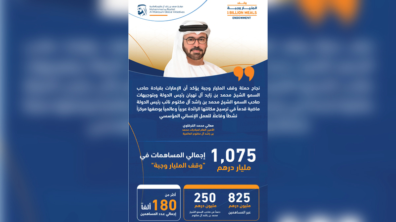 وأشار القرقاوي إلى أن «دعم صاحب السمو الشيخ محمد بن راشد آل مكتوم، لحملة وقف المليار وجبة بأصول عقارية ومبالغ نقدية قيمتها 250 مليون درهم، يمثل أجمل صور التشارك في العطاء بين القيادة والشعب في دولة الإمارات، ويعكس صورة القائد القدوة الذي يحرص على أن يكون خير نموذج لكل ما تمثله الإمارات من قيم البذل والإحسان والتعاضد».