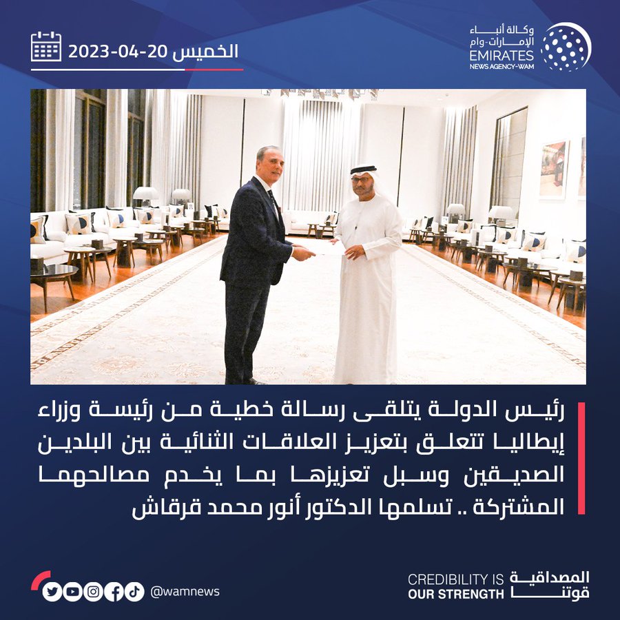 تسلم الرسـالة معالي الدكتور أنور محمد قرقاش المستشار الدبلوماسي لصاحب السمو رئيس الدولة خلال استقباله سعادة لوكا فيراري المبعوث الخاص لرئيس مجلس وزراء الجمهورية الإيطالية، بحضور سعادة لورينزو فانارا السفير الإيطالي لدى الدولة.