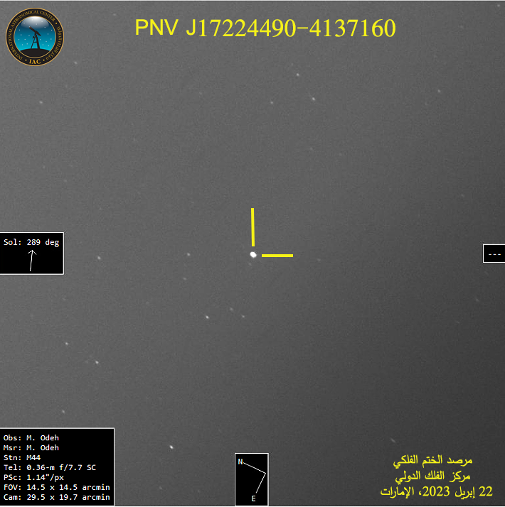 أعلن مرصد الختم الفلكي، التابع لمركز الفلك الدولي عن تصويره من سماء الإمارات نجم منفجر (Nova ) اكتشف قبل يومين ويقع في مجموعة العقرب، لمعانه الآن من القدر 7.8 (يرى بالمناظير)، بعد أن كان من القدر 19.7 قبل انفجاره ( كان لا يرى إلا بالتلسكوبات الكبيرة).