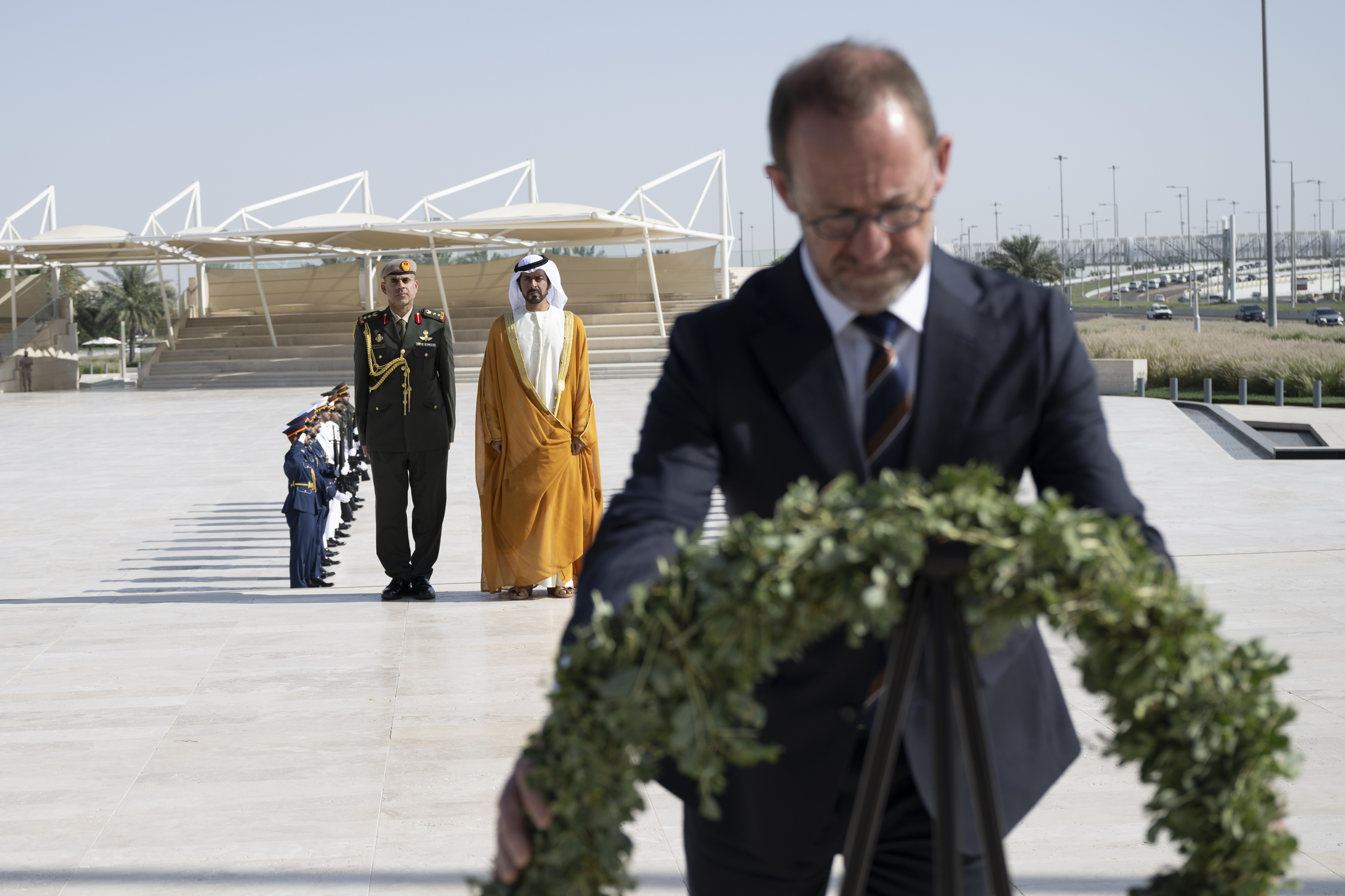 و استعرض وزير الدفاع النيوزلندي لدى وصوله إلى واحة الكرامة مع الشيخ خليفة بن طحنون آل نهيان مراسم حرس الشرف ثم وضع إكليلا أمام نصب الشهيد الذي يتكون من 31 لوحا يستند كل منها على الآخر رمزا للوحدة والتكاتف والتضامن بين قيادة دولة الإمارات وشعبها وجنودها الأبطال.
