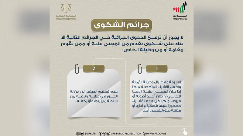 أكدت النيابة العامة للدولة أنه لا يجوز أن ترفع الدعوى الجزائية في خمس جرائم إلا بناء على شكوى تقدم من المجني عليه، أو ممن يقوم مقامه، أو من وكيله الخاص، وهي: أولاً السرقة والاحتيال وخيانة الأمانة وإخفاء الأشياء المتحصلة منها، إذا كان المجني عليه زوجاً للجاني أو كان أحد أصوله أو فروعه، ولم تكن هذه الأشياء محجوزاً عليها قضائياً أو إدارياً أو مثقلة بحق لشخص آخر. وثانياً عدم تسليم الصغير إلى من له الحق في طلبه ونزعه من سلطة من يتولاه أو يكفله. وثالثاً الامتناع عن أداء النفقة أو أجرة الحضانة أو الرضاعة أو المسكن المحكوم بها. ورابعاً سب الأشخاص وقذفهم. وخامساً الجرائم الأخرى التي ينص عليها القانون. وأوضحت النيابة العامة، عبر حسابها الرسمي على موقع «تويتر»، أنه لا تقبل الشكوى بعد ثلاثة أشهر من يوم علم المجني عليه بالجريمة ومرتكبها، ما لم ينص القانون على خلاف ذلك، وذلك استناداً إلى المادة (11) من قانون الإجراءات الجزائية الصادر بالمرسوم بقانون رقم 38 لسنة 2022.
