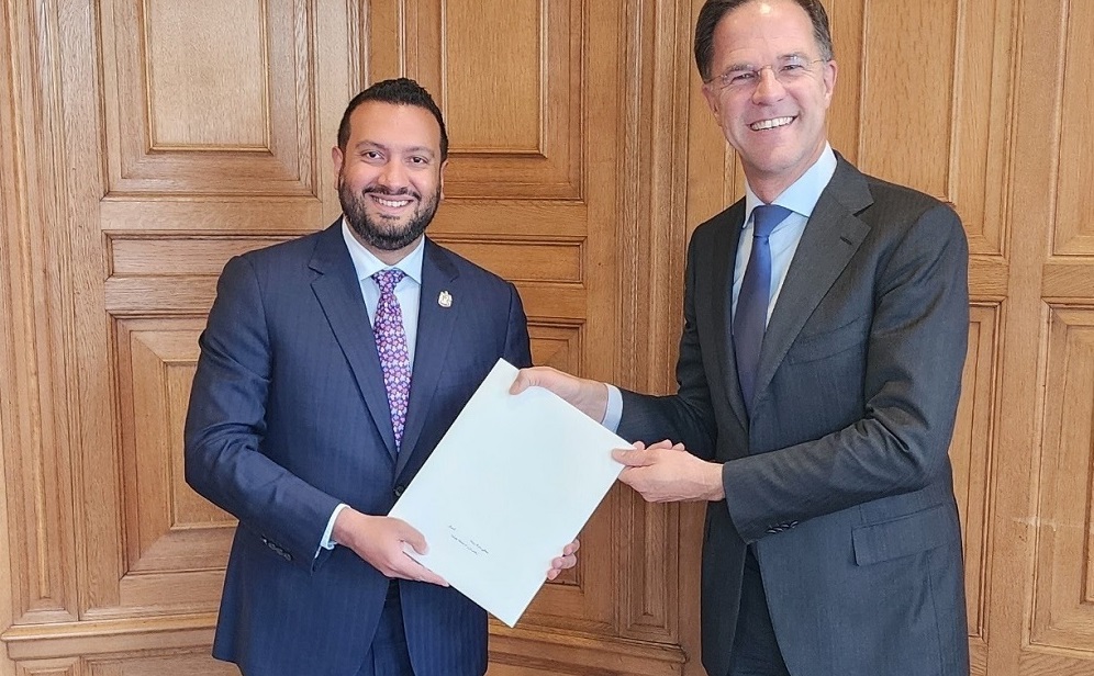 وسلم الدعوة إلى معالي رئيس الوزراء الهولندي، سعادة جمال جامع المشرخ، سفير الدولة لدى مملكة هولندا.