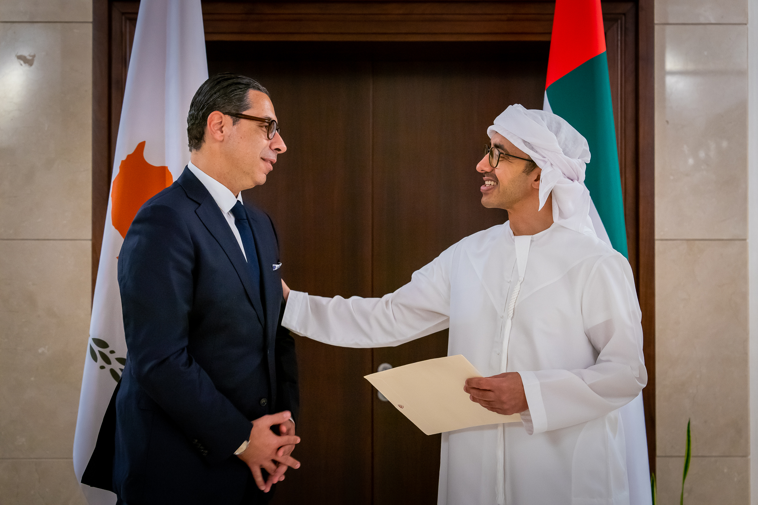 تسلم الرسالة سمو الشيخ عبدالله بن زايد آل نهيان وزير الخارجية لدى استقباله في أبوظبي معالي الدكتور كونستانتينوس كومبوس وزير خارجية قبرص.
