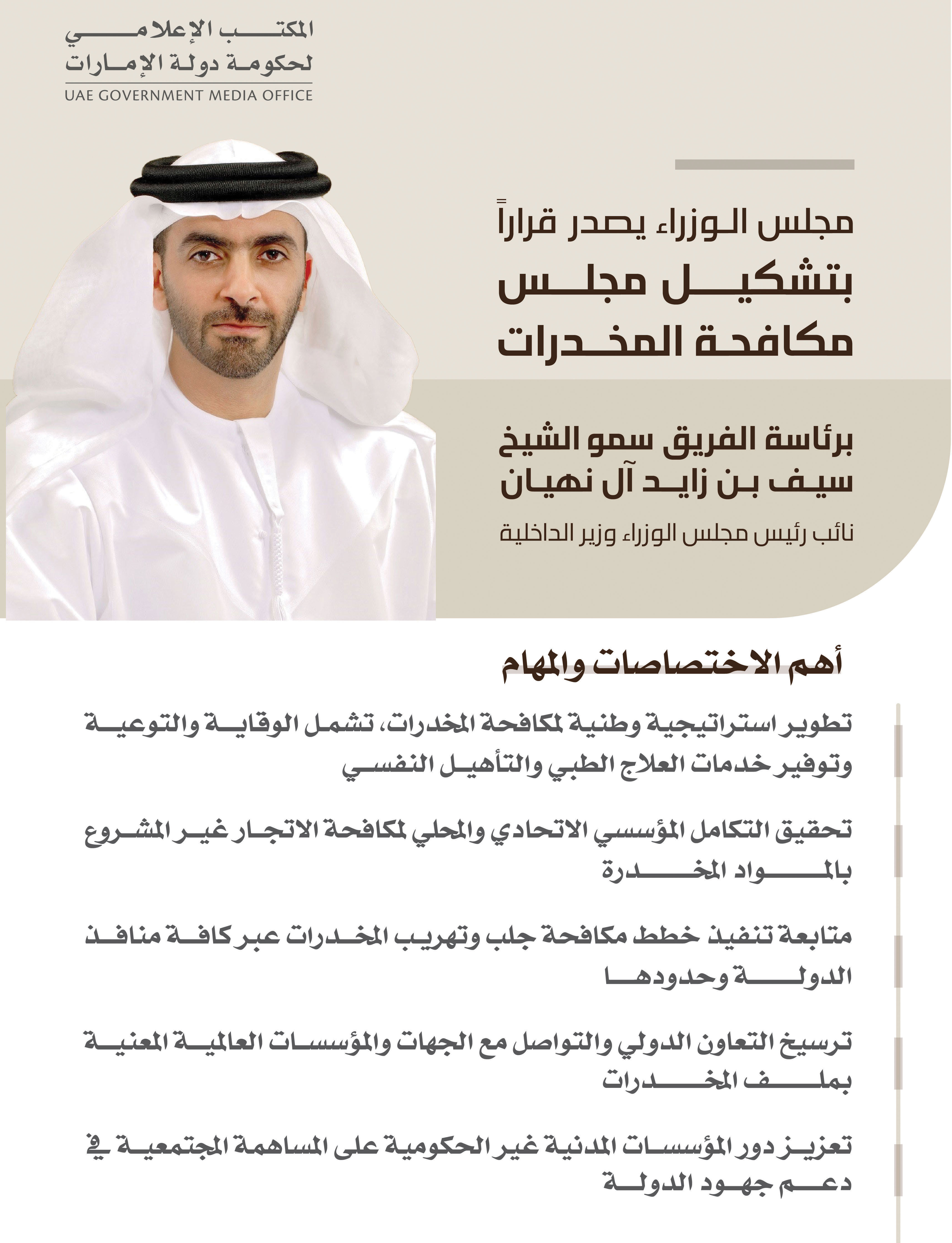 وقال صاحب السمو الشيخ محمد بن راشد آل مكتوم: «ترأست اجتماعاً لمجلس الوزراء في قصر الوطن بأبوظبي، أقررنا خلاله تشكيل (مجلس مكافحة المخدرات) برئاسة أخي سيف بن زايد، ويهدف لمكافحة جلب وتهريب المخدرات، وتعزيز التعاون الدولي في هذا المجال، وتعزيز دور الوزارات الاتحادية والهيئات المحلية، للمساهمة مع المؤسسات الأمنية في مكافحة هذه الآفة، وتوفير سبل الكشف المبكر، وتعزيز آليات العلاج الطبي والنفسي والتأهيلي للمتعافين، وإدماجهم في المجتمع».