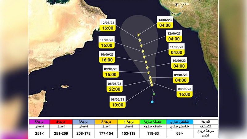 وذكر المركز أنه، وفقاً للنماذج العددية والتقارير الصادرة من مركز مراقبة الأعاصير الإقليمي، سيتعمّق الإعصار المداري من الدرجة الأولى إلى الدرجة الثانية في ساعات الليل حتى الصباح الباكر، ثم يضعف إلى الدرجة الأولى اعتباراً من صباح اليوم، موضحاً أن اتجاه الإعصار سيتحوّل إلى شمال بحر العرب، حيث تراوح سرعة الرياح حول المركز بين 140 و165 كم/ س، وسرعة تحرك الإعصار سبعة كم/س، مجدداً التأكيد على أنه لا يوجد أي تأثير على الدولة من الإعصار خلال الأيام الخمسة المقبلة.