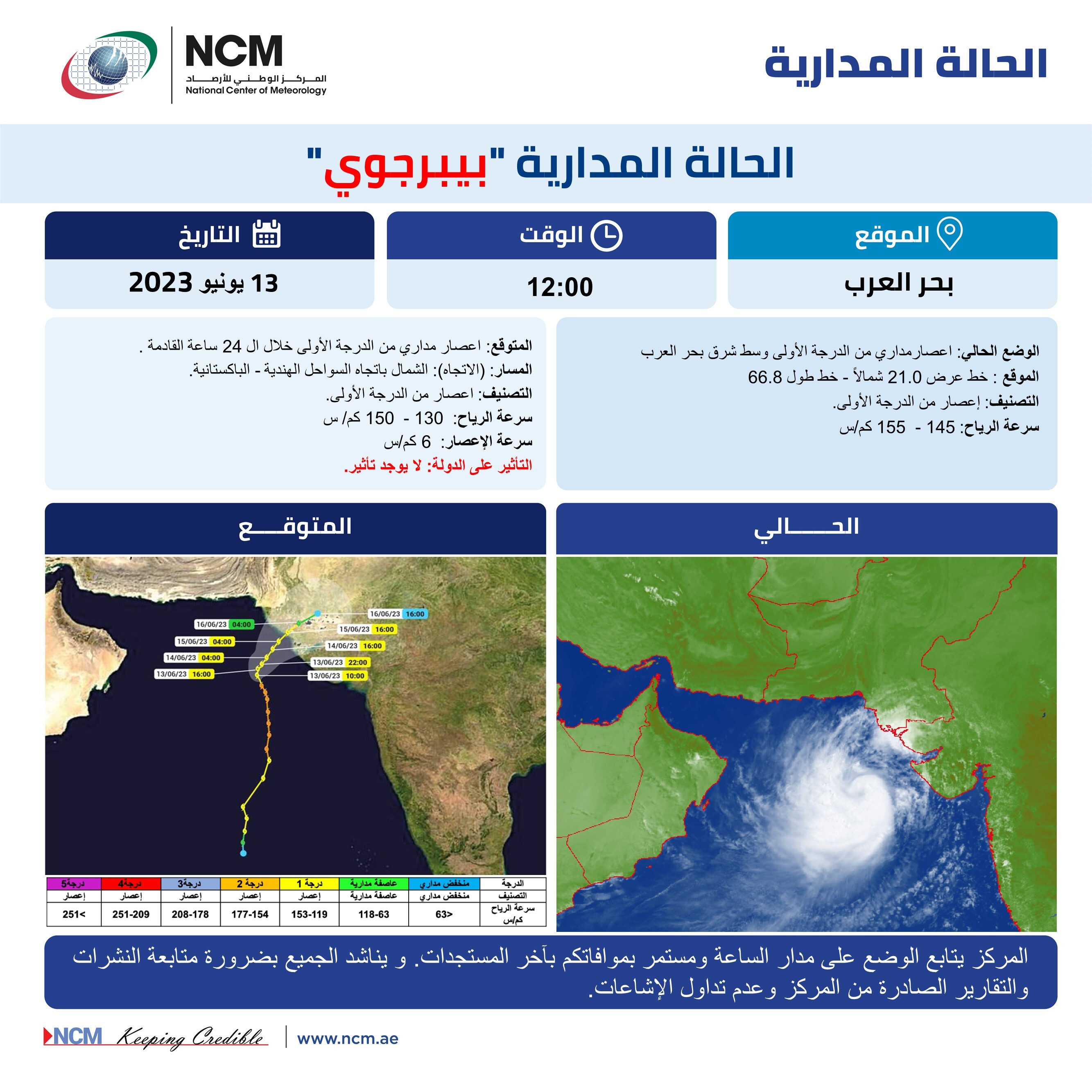 ومن خلال النماذج العددية والتقارير الصادرة من مركز مراقبة الأعاصير الاقليمي من المتوقع توجه الإعصار للشمال نحو السواحل الهندية - الباكستانية، حيث تتراوح سرعة الرياح حول المركز 130 – 150 كم/ س وسرعة تحرك الاعصار 6 كم/ س.
