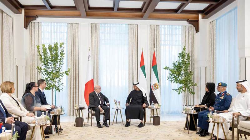 استقبل صاحب السمو الشيخ محمد بن زايد آل نهيان، رئيس الدولة، أمس، رئيس جمهورية مالطا، جورج فيلا، الذي يقوم بزيارة رسمية إلى دولة الإمارات.