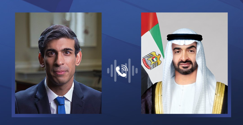 بحث صاحب السمو الشيخ محمد بن زايد آل نهيان رئيس الدولة "حفظه الله" ومعالي ريشي سوناك رئيس وزراء المملكة المتحدة - خلال اتصال هاتفي - العلاقات التاريخية بين دولة الإمارات والمملكة المتحدة وسبل تطوير آفاق الشراكة الإستراتيجية لدفع التقدم في إطار "الشراكة من أجل المستقبل" والتي أعلنها البلدان خلال شهر سبتمبر عام 2021.